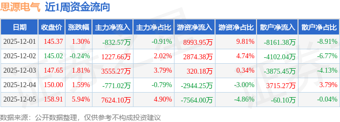 资金流向数据方面,本周思源电气主力资金合计净流入1.08亿元,游资资金合计净流入1680.27万元,散户资金合计净流出1.25亿元。本周资金流向一览见下表: