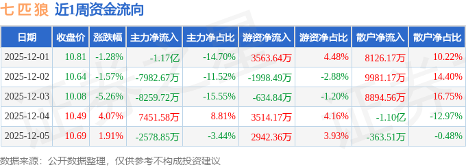 证券之星消息,截至2025年12月5日收盘,七 匹 狼(002029)报收于10.69元,较上周的10.95元下跌2.37%。本周,七 匹 狼12月1日盘中最高价报11.25元。12月5日盘中最低价报10.01元。七 匹 狼当前最新总市值75.37亿元,在服装家纺板块市值排名11/59,在两市A股市值排名2396/5169。