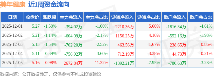 资金流向数据方面,本周美年健康主力资金合计净流入215.61万元,游资资金合计净流入2650.14万元,散户资金合计净流出2865.75万元。本周资金流向一览见下表: