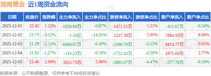 资金流向数据方面,本周湖南黄金主力资金合计净流出1.71亿元,游资资金合计净流出320.22万元,散户资金合计净流入1.74亿元。本周资金流向一览见下表: