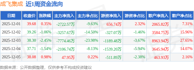 资金流向数据方面,本周成飞集成主力资金合计净流出1.58亿元,游资资金合计净流出2910.89万元,散户资金合计净流入1.87亿元。本周资金流向一览见下表: