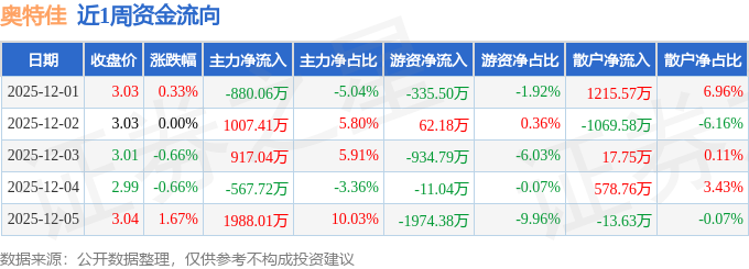 资金流向数据方面,本周奥特佳主力资金合计净流入2464.67万元,游资资金合计净流出3193.53万元,散户资金合计净流入728.87万元。本周资金流向一览见下表: