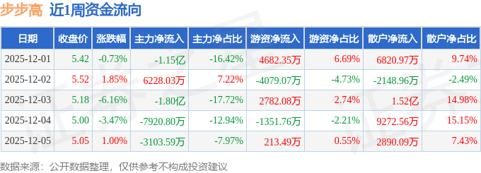资金流向数据方面,本周步步高主力资金合计净流出3.43亿元,游资资金合计净流入2247.1万元,散户资金合计净流入3.21亿元。本周资金流向一览见下表: