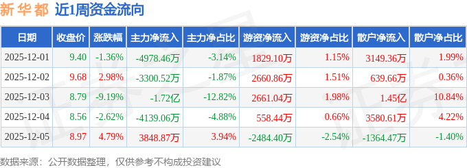 资金流向数据方面,本周新 华 都主力资金合计净流出2.58亿元,游资资金合计净流入5225.04万元,散户资金合计净流入2.06亿元。本周资金流向一览见下表: