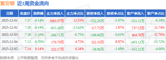 资金流向数据方面,本周富安娜主力资金合计净流入354.34万元,游资资金合计净流出349.13万元,散户资金合计净流出5.21万元。本周资金流向一览见下表: