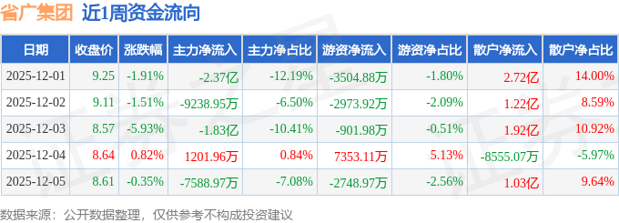 资金流向数据方面,本周省广集团主力资金合计净流出5.76亿元,游资资金合计净流出2776.64万元,散户资金合计净流入6.04亿元。本周资金流向一览见下表: