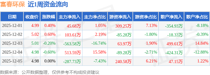 资金流向数据方面,本周富春环保主力资金合计净流出188.44万元,游资资金合计净流入439.25万元,散户资金合计净流出250.81万元。本周资金流向一览见下表: