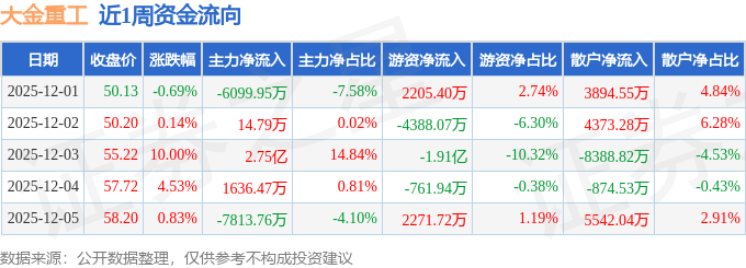 资金流向数据方面,本周大金重工主力资金合计净流入1.53亿元,游资资金合计净流出1.98亿元,散户资金合计净流入4546.52万元。本周资金流向一览见下表: