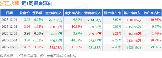 资金流向数据方面,本周浙江永强主力资金合计净流出124.03万元,游资资金合计净流出870.93万元,散户资金合计净流入994.96万元。本周资金流向一览见下表: