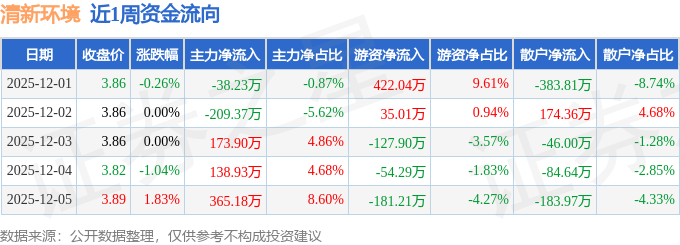 资金流向数据方面,本周清新环境主力资金合计净流入430.4万元,游资资金合计净流入93.65万元,散户资金合计净流出524.05万元。本周资金流向一览见下表:
