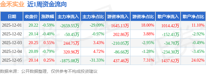 资金流向数据方面,本周金禾实业主力资金合计净流出4019.36万元,游资资金合计净流入1988.73万元,散户资金合计净流入2030.64万元。本周资金流向一览见下表: