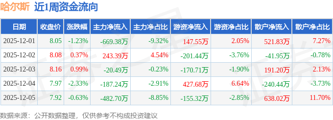 资金流向数据方面,本周哈尔斯主力资金合计净流出1116.41万元,游资资金合计净流入47.76万元,散户资金合计净流入1068.65万元。本周资金流向一览见下表: