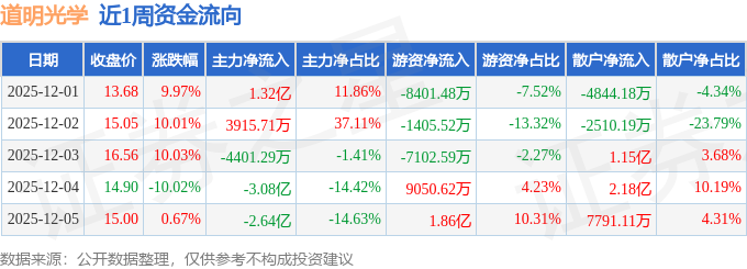 资金流向数据方面,本周道明光学主力资金合计净流出4.45亿元,游资资金合计净流入1.08亿元,散户资金合计净流入3.37亿元。本周资金流向一览见下表:
