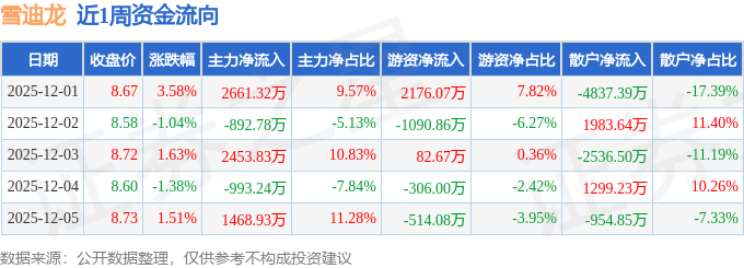 资金流向数据方面,本周雪迪龙主力资金合计净流入4698.07万元,游资资金合计净流入347.8万元,散户资金合计净流出5045.88万元。本周资金流向一览见下表: