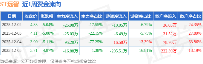 资金流向数据方面,本周ST远智主力资金合计净流出163.09万元,游资资金合计净流出205.56万元,散户资金合计净流入368.65万元。本周资金流向一览见下表: