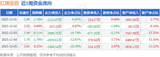 资金流向数据方面,本周红旗连锁主力资金合计净流出1.09亿元,游资资金合计净流入66.36万元,散户资金合计净流入1.08亿元。本周资金流向一览见下表: