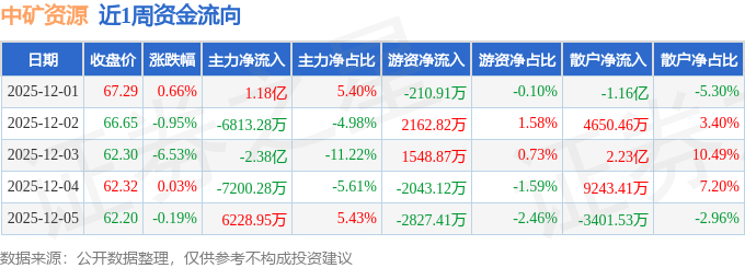 资金流向数据方面,本周中矿资源主力资金合计净流出1.98亿元,游资资金合计净流出1369.75万元,散户资金合计净流入2.12亿元。本周资金流向一览见下表: