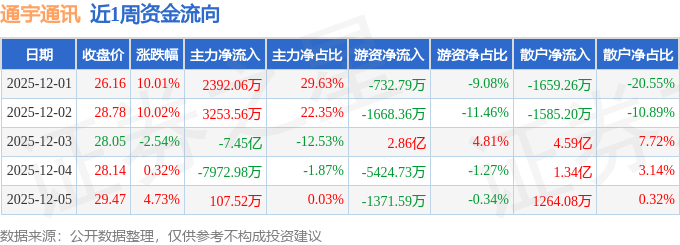 资金流向数据方面,本周通宇通讯主力资金合计净流出7.67亿元,游资资金合计净流入1.94亿元,散户资金合计净流入5.73亿元。本周资金流向一览见下表: