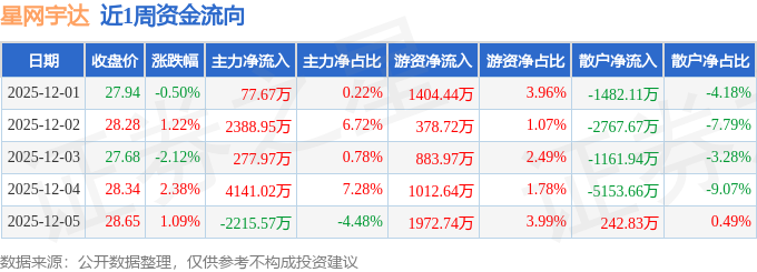 资金流向数据方面,本周星网宇达主力资金合计净流入4670.03万元,游资资金合计净流入5652.52万元,散户资金合计净流出1.03亿元。本周资金流向一览见下表: