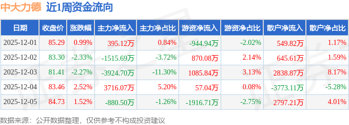 资金流向数据方面,本周中大力德主力资金合计净流出2209.71万元,游资资金合计净流出848.69万元,散户资金合计净流入3058.4万元。本周资金流向一览见下表: