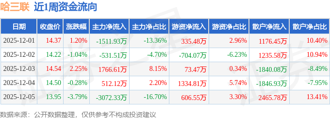 资金流向数据方面,本周哈三联主力资金合计净流出2837.03万元,游资资金合计净流入1646.24万元,散户资金合计净流入1190.8万元。本周资金流向一览见下表: