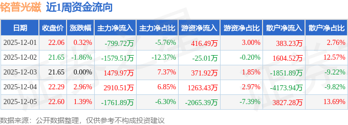 资金流向数据方面,本周铭普光磁主力资金合计净流入249.36万元,游资资金合计净流出38.55万元,散户资金合计净流出210.81万元。本周资金流向一览见下表: