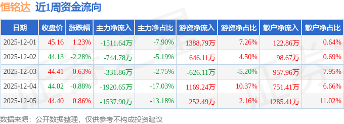 资金流向数据方面,本周恒铭达主力资金合计净流出6046.84万元,游资资金合计净流入2830.53万元,散户资金合计净流入3216.31万元。本周资金流向一览见下表: