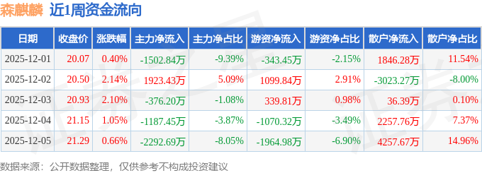 资金流向数据方面,本周森麒麟主力资金合计净流出3435.75万元,游资资金合计净流出1939.1万元,散户资金合计净流入5374.84万元。本周资金流向一览见下表: