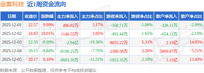 资金流向数据方面,本周金富科技主力资金合计净流出4.55亿元,游资资金合计净流入7922.1万元,散户资金合计净流入3.76亿元。本周资金流向一览见下表: