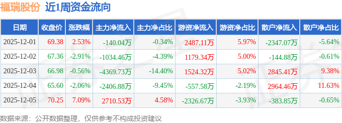 资金流向数据方面,本周福瑞股份主力资金合计净流出5240.57万元,游资资金合计净流入2306.5万元,散户资金合计净流入2934.07万元。本周资金流向一览见下表: