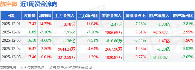 资金流向数据方面,本周航宇微主力资金合计净流入1.97亿元,游资资金合计净流出1.32亿元,散户资金合计净流出6501.58万元。本周资金流向一览见下表: