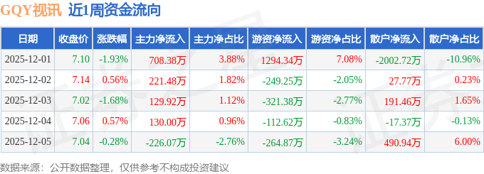 资金流向数据方面,本周GQY视讯主力资金合计净流入963.7万元,游资资金合计净流入346.21万元,散户资金合计净流出1309.91万元。本周资金流向一览见下表: