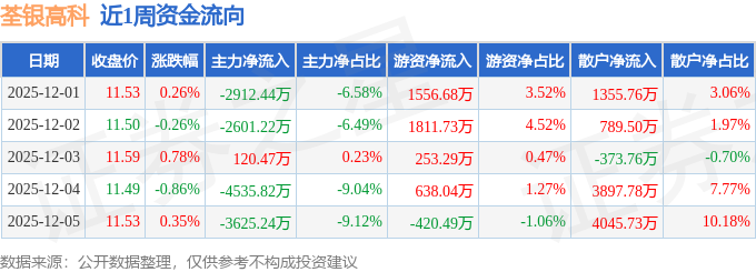 资金流向数据方面,本周荃银高科主力资金合计净流出1.36亿元,游资资金合计净流入3839.24万元,散户资金合计净流入9715.01万元。本周资金流向一览见下表: