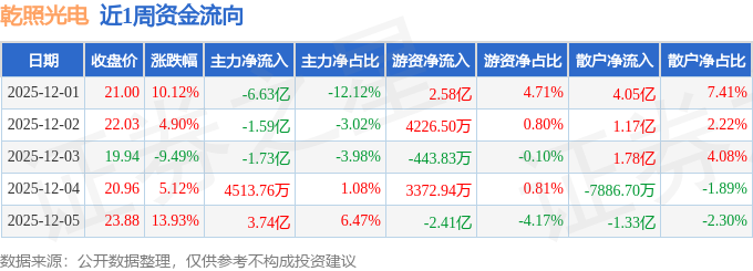 资金流向数据方面,本周乾照光电主力资金合计净流出5.76亿元,游资资金合计净流入8839.41万元,散户资金合计净流入4.88亿元。本周资金流向一览见下表: