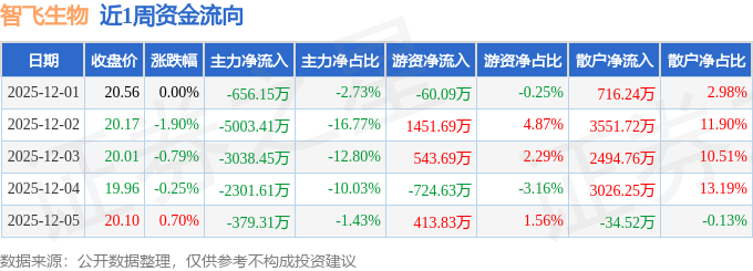资金流向数据方面,本周智飞生物主力资金合计净流出1.14亿元,游资资金合计净流入1624.48万元,散户资金合计净流入9754.46万元。本周资金流向一览见下表: