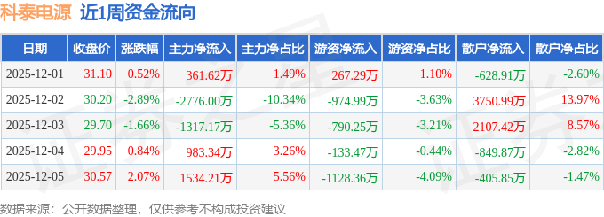资金流向数据方面,本周科泰电源主力资金合计净流出1214.0万元,游资资金合计净流出2759.77万元,散户资金合计净流入3973.77万元。本周资金流向一览见下表: