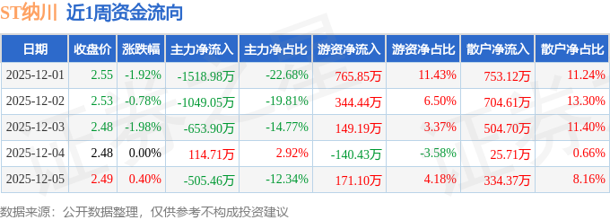 资金流向数据方面,本周ST纳川主力资金合计净流出3612.68万元,游资资金合计净流入1290.16万元,散户资金合计净流入2322.52万元。本周资金流向一览见下表: