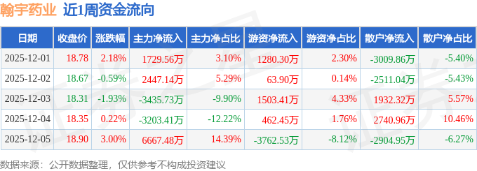 资金流向数据方面,本周翰宇药业主力资金合计净流入4205.04万元,游资资金合计净流出452.47万元,散户资金合计净流出3752.57万元。本周资金流向一览见下表: