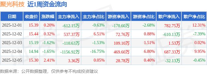 资金流向数据方面,本周聚光科技主力资金合计净流出1338.97万元,游资资金合计净流入509.64万元,散户资金合计净流入829.34万元。本周资金流向一览见下表: