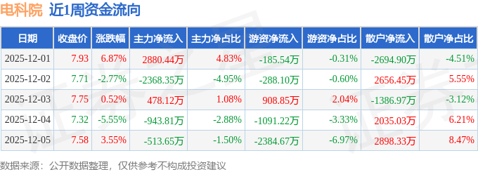资金流向数据方面,本周电科院主力资金合计净流出467.25万元,游资资金合计净流出3040.69万元,散户资金合计净流入3507.94万元。本周资金流向一览见下表: