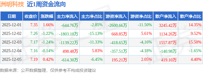资金流向数据方面,本周洲明科技主力资金合计净流出3702.9万元,游资资金合计净流出2512.77万元,散户资金合计净流入6215.67万元。本周资金流向一览见下表: