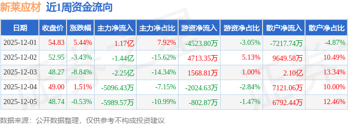 资金流向数据方面,本周新莱应材主力资金合计净流出3.62亿元,游资资金合计净流出1069.13万元,散户资金合计净流入3.73亿元。本周资金流向一览见下表: