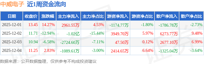 资金流向数据方面,本周中威电子主力资金合计净流出1.11亿元,游资资金合计净流入5237.08万元,散户资金合计净流入5839.05万元。本周资金流向一览见下表: