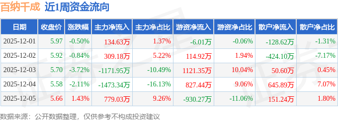 资金流向数据方面,本周百纳千成主力资金合计净流出1422.45万元,游资资金合计净流入1127.43万元,散户资金合计净流入295.02万元。本周资金流向一览见下表:
