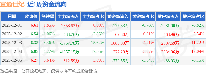 资金流向数据方面,本周宜通世纪主力资金合计净流出5582.47万元,游资资金合计净流入1394.9万元,散户资金合计净流入4187.57万元。本周资金流向一览见下表: