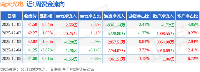 资金流向数据方面,本周南大光电主力资金合计净流出1.14亿元,游资资金合计净流入1983.15万元,散户资金合计净流入9390.75万元。本周资金流向一览见下表: