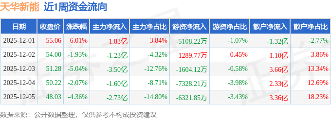资金流向数据方面,本周天华新能主力资金合计净流出7.23亿元,游资资金合计净流出1.91亿元,散户资金合计净流入9.14亿元。本周资金流向一览见下表:
