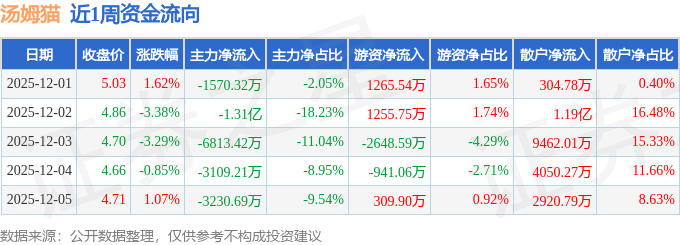资金流向数据方面,本周汤姆猫主力资金合计净流出2.78亿元,游资资金合计净流出758.47万元,散户资金合计净流入2.86亿元。本周资金流向一览见下表: