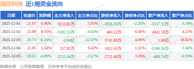 资金流向数据方面,本周润欣科技主力资金合计净流出1.83亿元,游资资金合计净流入4289.85万元,散户资金合计净流入1.4亿元。本周资金流向一览见下表: