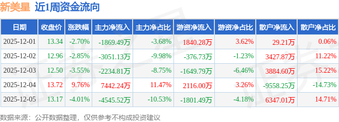 资金流向数据方面,本周新美星主力资金合计净流出4258.7万元,游资资金合计净流入128.27万元,散户资金合计净流入4130.44万元。本周资金流向一览见下表: